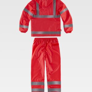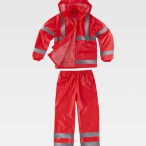 Fato de água impermeável com fitas refletoras. Parte superior: Impermeável com fecho de correr de náilon. Gola alta com capuz interior ajustável com cordão. Dois bolsos laterais sobrepostos. Um bolso de chapa no peito com velcro no interior. Uma fita refletora nos ombros e duas no peito, nas costas e nas mangas. Punho elástico no interior da manga. Baixo ajustável com cordão. Revestido no interior. Parte inferior: Calça impermeável com cintura elástica. Duas fitas refletoras nas perneiras. Aberturas laterais de acesso no interior. Baixo ajustável com presilhas.
