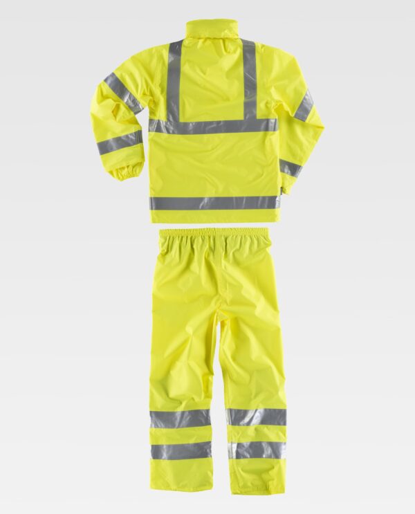 Fato de água impermeável, de alta visibilidade com fitas refletoras. Parte superior: Impermeável com fecho de correr. Gola alta com capuz interior ajustável com cordão. Dois bolsos laterais sobrepostos. Um bolso de chapa no peito com velcro no interior. Uma fita refletora nos ombros e duas no peito, nas costas e nas mangas. Punho elástico no interior da manga. Baixo ajustável com cordão. Revestido no interior. Parte inferior: Calça impermeável com cintura elástica. Duas fitas refletoras nas perneiras. Aberturas laterais de acesso no interior. Baixo ajustável com presilhas.