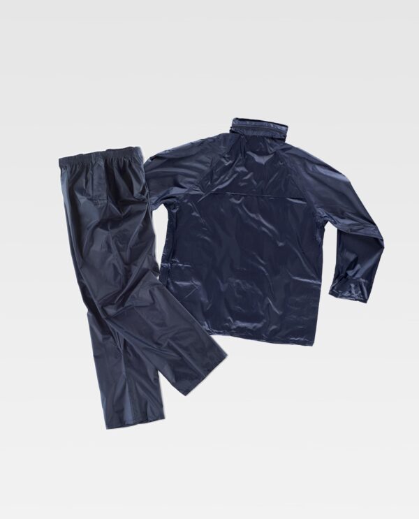 Fato de água impermeável. Parte superior: Impermeável de manga raglã com com fecho de correr. Gola alta com capuz interior ajustável com cordão. Dois bolsos laterais sobrepostos. Punho elástico no interior da manga. Baixo ajustável com cordão. Corpete aberto nas costas com rede interior para regular a transpiração. Parte inferior: Calça impermeável com cintura elástica. Aberturas laterais de aceso no interior. Baixo ajustável com presilhas.