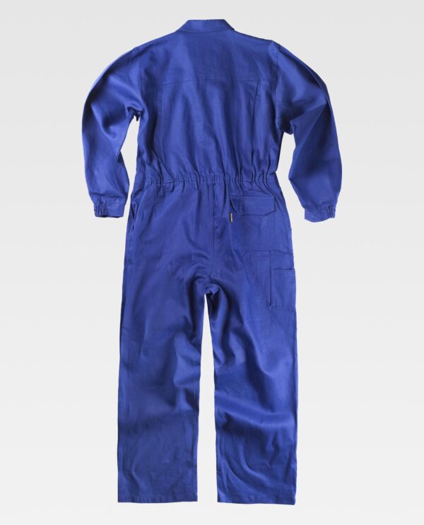 Fato macaco de algodão com corpete. Gola tipo camiseiro e fecho de fecho de correr de metal com puxador duplo oculto por aba com velcro. Dois bolsos de chapa no peito com lapela de velcro, dois bolsos de abertura inclinada nos costados. Um bolso traseiro de chapa com lapela de velcro e um bolso de espátula duplo. Punho com elástico. Costas com pinças. Cinta com elástico nas costas.