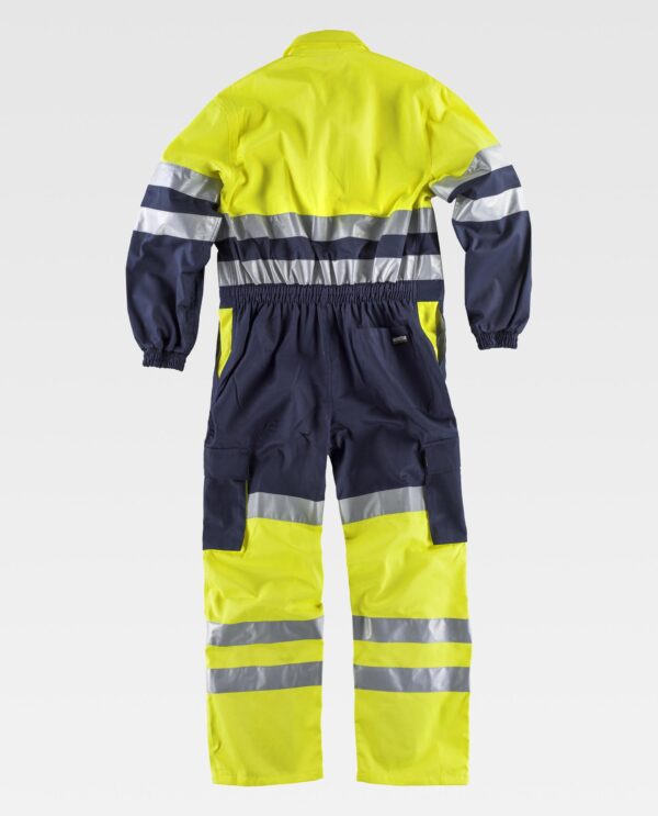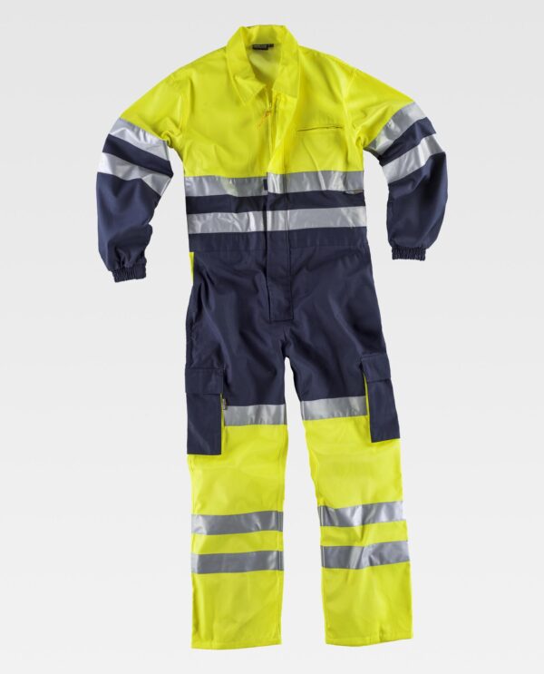 Fato macaco combinado de alta visibilidade e fitas refletoras. Gola tipo camiseiro e fecho de correr de puxador duplo oculto por aba de velcro. Um bolso no peito interior com fecho de correr, dois bolsos laterais de abertura inclinada, dois bolsos cargo laterais com fole e lapela de velcro. Um bolso traseiro de chapa. Fitas refletoras no peito, nas costas, nas mangas e nas perneiras. Parte superior, inferior e detalhes dos bolsos de alta visibilidade. Punho elástico. Elástico nas costas.