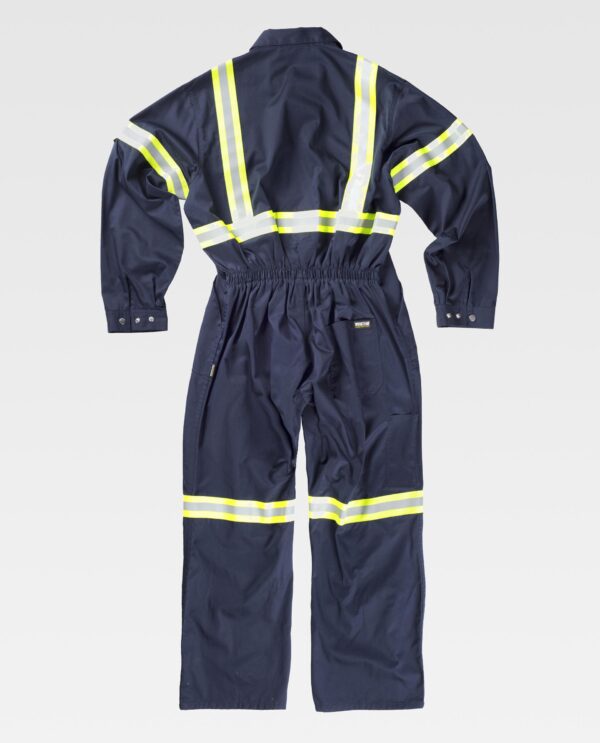 Fato macaco com fitas refletoras-fluorescentes. Gola tipo camiseiro e fecho de correr de náilon com puxador duplo oculto por aba com velcro. Um bolso no peito interior com fecho de correr de náilon, dois bolsos de chapa de abertura inclinada nos costados. Um bolso traseiro de chapa e um bolso de espátula. Uma fita fluorescente com uma fita refletora no peito, nas costas, nos ombros, mangas e perneiras. Punho com presilha metálica. Elástico nas costas.