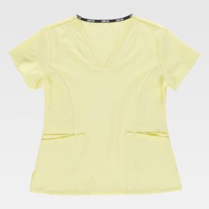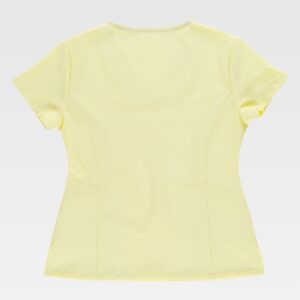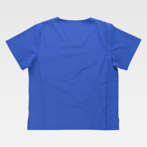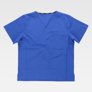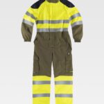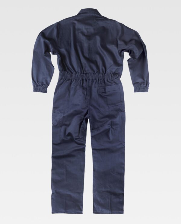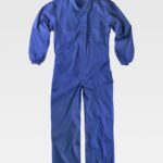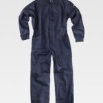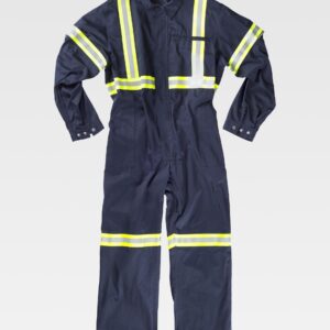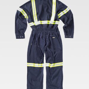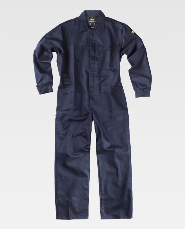 Fato macaco ignífugo e antiestático com gola tipo camiseiro e corpete no frente. Fecho de correr de metal com puxador duplo oculto e velcro. Um bolso de chapa no peito com fecho de correr metálico e lapela de seguridade. Dois bolsos nos costados e um bolso traseiro, todos de chapa sem fecho e com lapela de seguridade. Dois bolsos de espátula. Punho com elástico. Elástico nas costas.