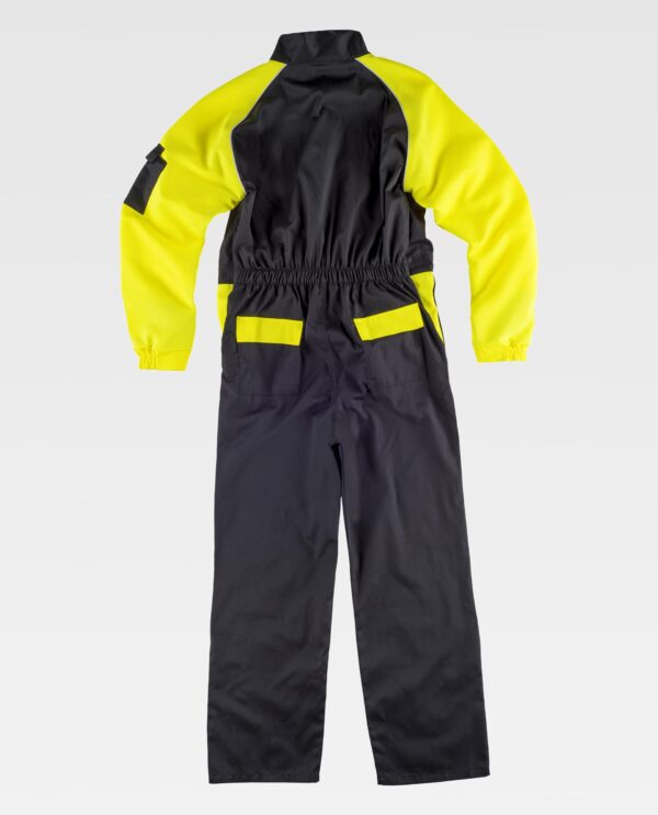 Fato-macaco combinado com vivos em contraste. Gola alta e fecho de cremalheira de náilon de duplo puxador oculto por lapela postiça. Velcro na gola e lapela. Manga rangla combinada, com vivos e um bolso auxiliar com fecho de velcro. Punho com elástico. Dois bolsos no peito de chapa com carteira de velcro, dois bolsos com abertura inclinada nos laterais. Dois bolsos traseiros de chapa com lapela de velcro. Lapelas e vistas combinadas. Reforço nos joelhos. Cintura com elástico nas costas.