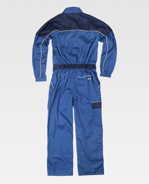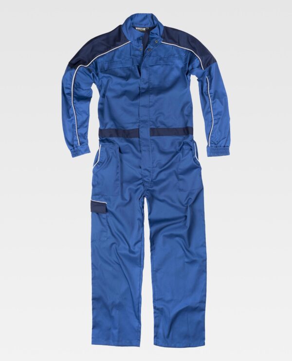 Fato macaco combinado com debruns em contraste. Gola alta e fecho de correr de náilon com puxador duplo e presilhas ocultas por aba. Dois bolsos no peito interiores sobrepostos com fecho de correr de náilon oculto, dois bolsos de chapa de abertura inclinada e debrum nos costados, um bolso cargo lateral com lapela de velcro e debrum em contraste. Um bolso traseiro de chapa com debrum. Corpete nas costas com peça combinada nos ombros. Acabado com debrum duplo que continua na manga. Punho com elástico. Cinta combinada com elástico nas costas.