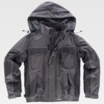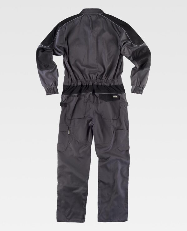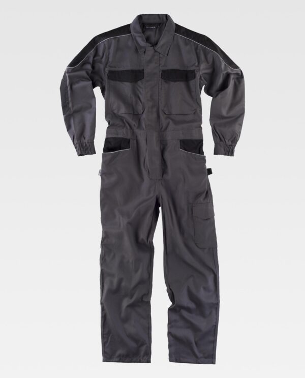 Fato macaco combinado, com reforços e costura tripla. Gola tipo camiseiro e fecho de correr de náilon de puxador duplo oculto por aba com velcro. Dois bolsos no peito com lapela de velcro, dois bolsos de abertura inclinada e debrum nos costados, um bolso cargo lateral com lapela de velcro. Dois bolsos traseiros com prega no baixo, um com lapela de velcro e um bolso de espátula. Passador porta martelo. Corpete na frente. Peça combinada nos ombros e mangas acabadas com debrum refletor. Joelheiras e reforço no assento. Presilhas em contraste. Punho com elástico. Elástico nas costas. Tratamento do tecido para maior estabilidade da cor, resistente às lavagens até 60º.