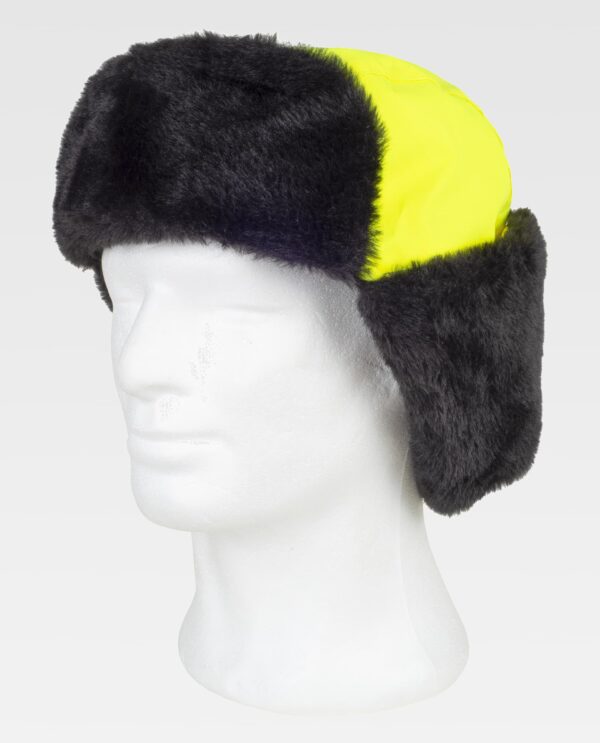 Boné com orelheiras dobráveis, forrado a pelo e acolchoado. Combinado com fluorescente e detalhes reflectantes.