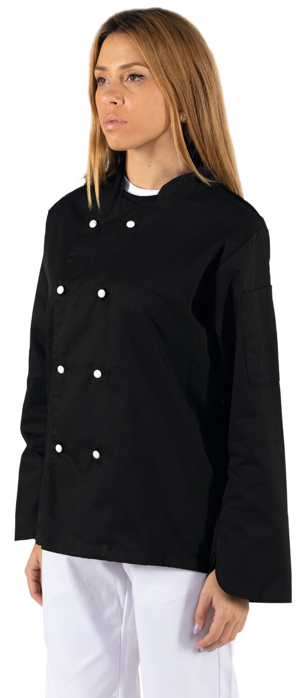 Jaleca unisexo em sarja.65% Poliester 35% Algodão de 200 g.Fecho por botões amoviveis de segurança;1 bolso na manga esquerda;
