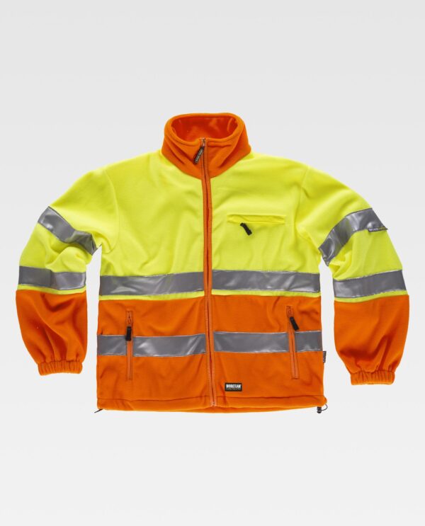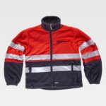 Jaqueta polar combinada com fitas refletoras. Gola alta e fecho de correr de náilon. Um bolso no peito e dois bolsos laterais interiores com fechos de correr de náilon. Duas fitas refletoras no peito, nas costas e nas mangas. Punho com elástico. Cordão elástico com peça ajustável na cintura.