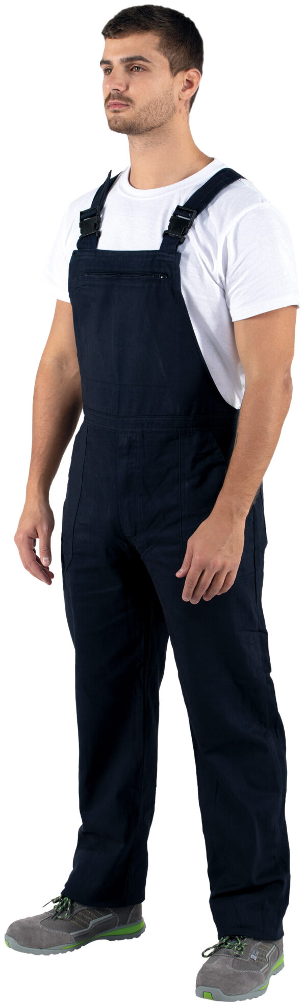 Jardineira 100% Algodão;Sarja de 240 g.;Costuras duplas;Suspensórios ajustáveis e elásticos;Cintura com elástico de ajuste;1 bolsos frontais e 3 laterais e 2 traseiros;
