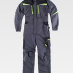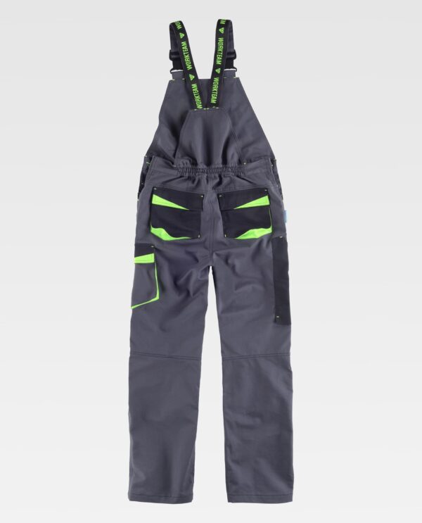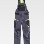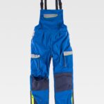 Jardineira tripla cor em tecido canvas. Meias costas cobertas, suspensórios com elástico e fivelas automáticas. Um bolso no peito com pasta de velcro e outro sobrepor compartimentar. Dois bolsos de abertura inclinada nos laterais. Um bolso lateral de espátula, outro de carga com lapela de velcro e outro sobrepor para canetas. Dois bolsos traseiros e pasta de velcro. Reforço nos joelhos com fecho de velcro. Vivos refletores e presilhas em contraste. Elástico nas costas. Nos laterais fecho de botões metálicos e braguilha de cremalheira de náilon.