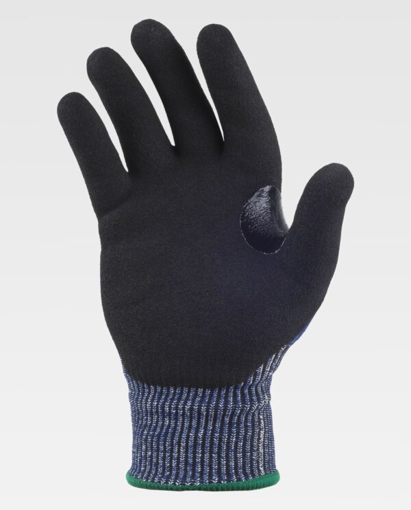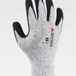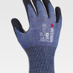 Luvas de 13 galgas, com suporte de diferentes fibras e revestimento de nitrilo microporoso, com reforço no polegar. O nitrilo proporciona uma elevada resistência ao desgaste e à abrasão, além de conferir flexibilidade e ductilidade, resistindo ao contacto com óleos, lubrificantes e gorduras. O suporte de HPPE, poliéster e fibra de vidro protege as mãos contra o manuseamento de ferramentas ou objetos com bordas afiadas e contra cortes que podem ocorrer em indústrias como a do vidro, cerâmica, madeira, matadouros, metalurgia, construção, etc. Ao não apresentar costuras, aumenta o conforto, evitando irritações por atrito. Reforço de nitrilo entre o polegar e o indicador que proporciona maior resistência ao desgaste e à ruptura. Punho elástico.
