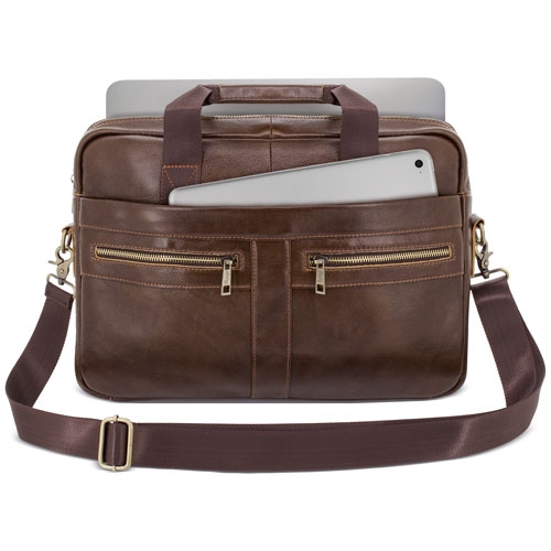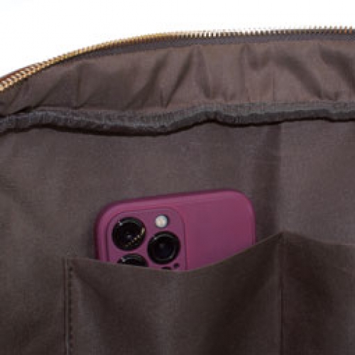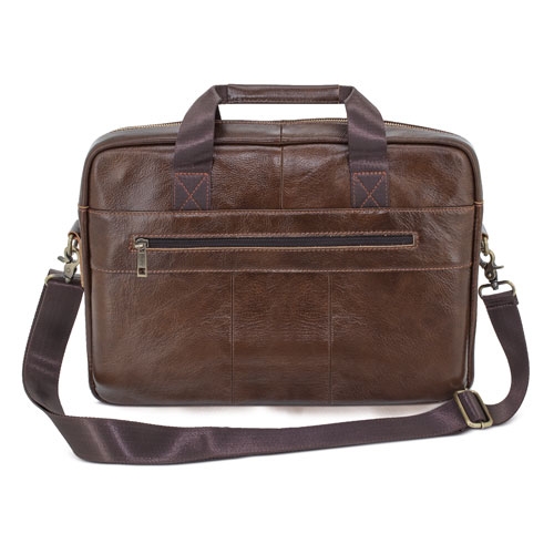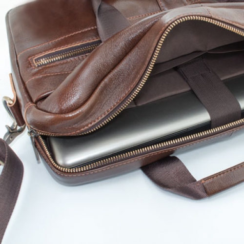 Realizado em autentica pele, com asas e fita para colocar no ombro.Bolsos exteriores com fecho zipper e interior almofadado.