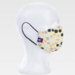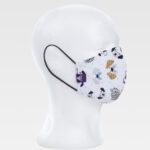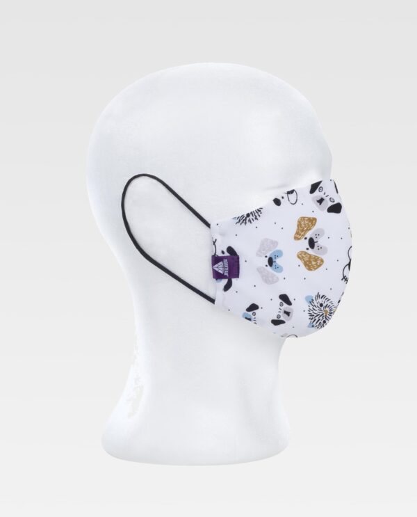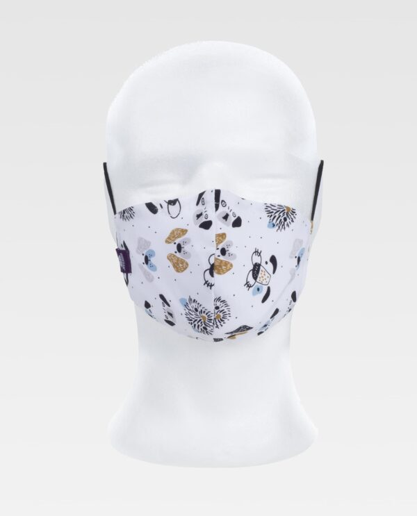Máscara reutilizável em tecido elástico e estampada. Pode inserir o filtro no interior. Inclui dois filtros.