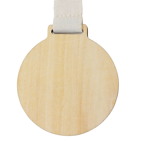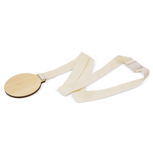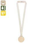 Medalha em madeira com fita de algodão e fecho de segurança em fibra de trigo