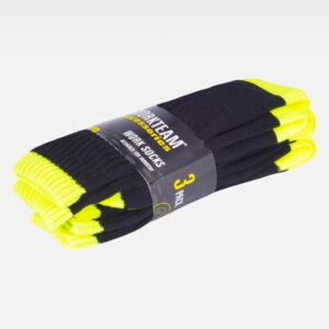 Meias de altura média. Confecionadas tecido respirável rico em algodão que promove a ventilação, com poliamida e elastano flexivel e ajustável. Largo contorno elástico na parte superior para uma maior sustentação e melhor ajuste. Reforçada no calcanhar com ponta de poliamida que aumenta sua resistência. Métodos adequados de marcação: bordados, cosidos. Ideal para uso diário como complemento de roupa de trabalho e fardas.