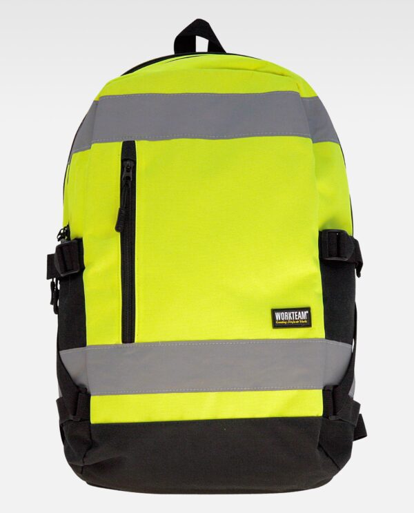 Mochila de alta visibilidade com fitas refletoras e dois compartimentos. Capacidade 25 litros.