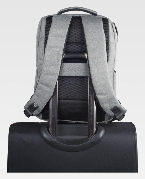 Mochila para laptop, capacidade de 16 litros. Compartimento de grande capacidade com fecho de correr duplo. Compartimento interno para laptop de 16”. Dois bolsos frontais com fecho de correr. Um compartimento lateral. Alça acolchoada na parte superior. Costas acolchoadas e alça de bagagem.