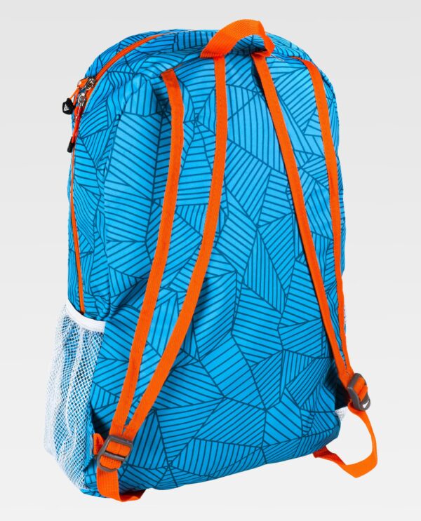 Mochila de enrolar estampada com 21 l de capacidade. Um compartimento de grande capacidade com subdivisão interior. Um compartimento central grande com fecho de fivela. Um bolso frontal com fecho de correr. Dois compartimentos laterais em rede. Pega na parte superior. Saco de transporte com pega ajustável.