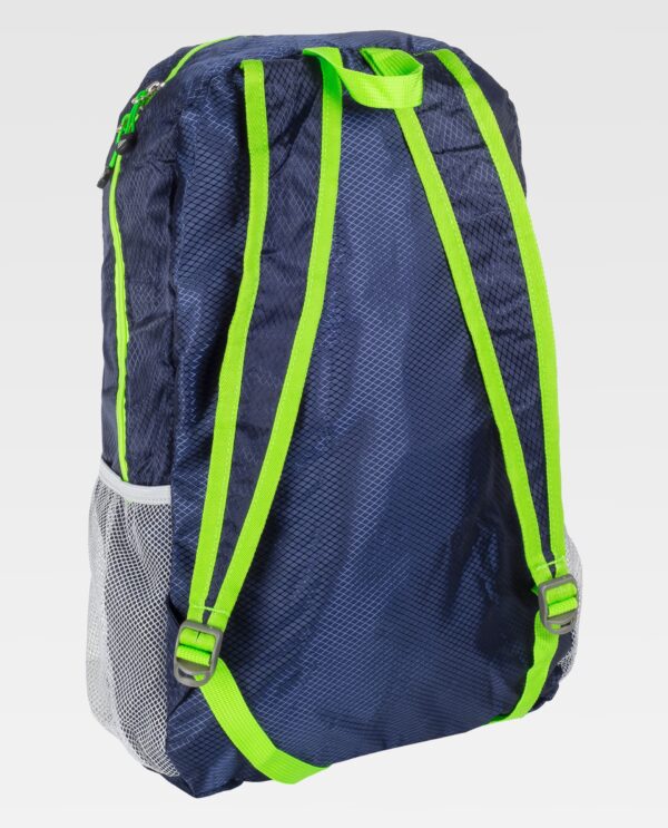 Mochila de enrolar com uma capacidade de 21l. Um compartimento de grande capacidade com uma subdivisão interior. Um compartimento central grande com fecho de fivela. Um bolso frontal com fecho de correr. Dois compartimentos laterais em rede. Pega na parte superior. Saco de transporte com alça de ombro ajustável.