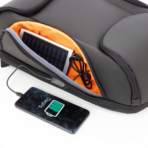 Mochila semi-rígida com bolso traseiro anti-roubo (medida 31×16 cm)Conta com uma entrada USB num dos seus laterais para conectar a nossa bateria portátil desde o interior e poder cargar o nosso teléfone móvil ou dispositivos enquanto os utilizamos no exterior.Interior almofadado para portátil de até 15,6″Na parte traseira, inclui sujeiçao elástica para levar num trolley Abertura 180º e fecho de segurança