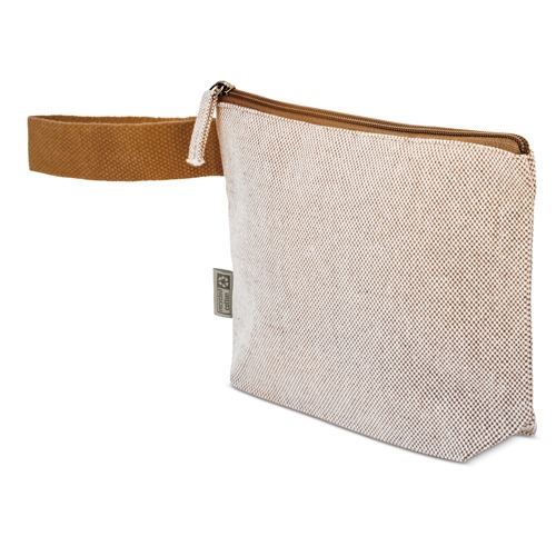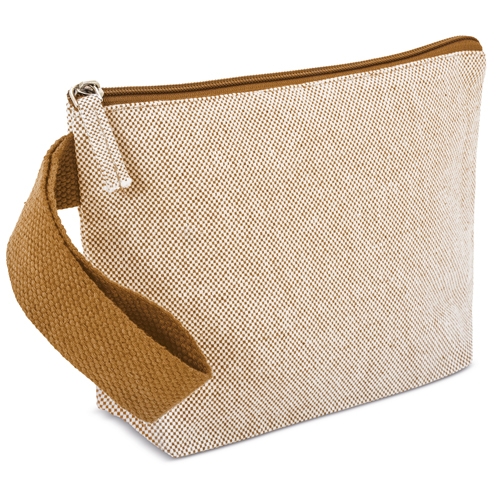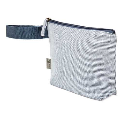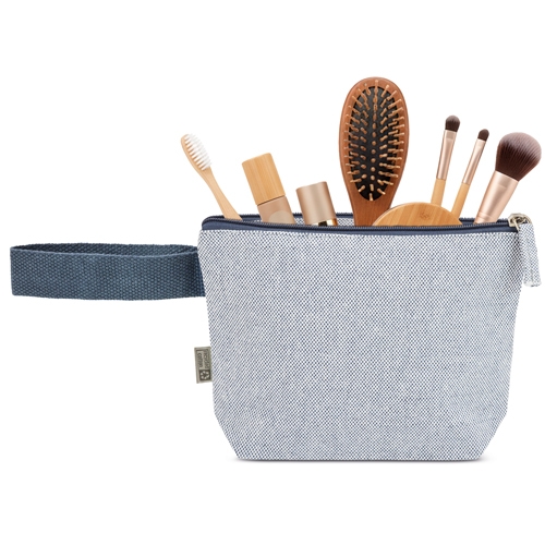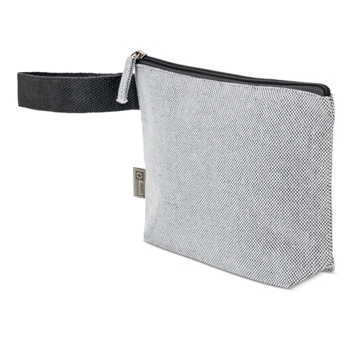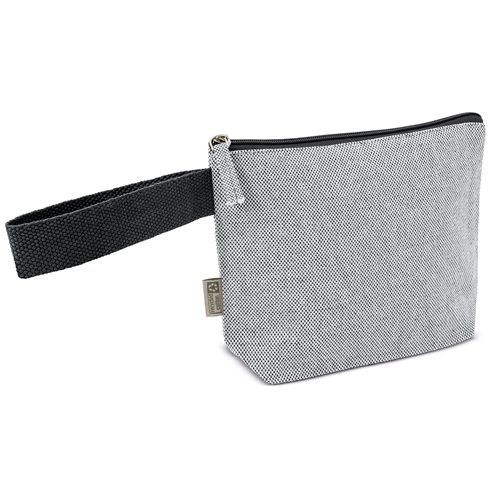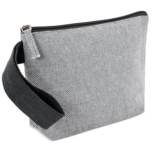 Nécessaire de viagem feita em algodão reciclado com efeito mesclado. O seu tamanho prático torna-a perfeita para viagens, eventos ou uso diário.