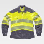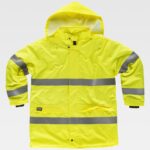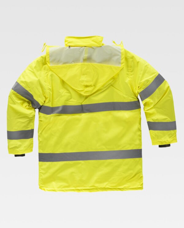 Parka acolchoada e impermeável em tecido Oxford, de alta visibilidade e com fitas refletoras. Gola alta com capuz desmontável ajustável com cordão. Fecho de correr oculto por aba por com presilha na cintura e passadores na gola. Dois bolsos laterais sobrepostos. Um bolso no peito de chapa no interior. Duas fitas refletoras no peito, nas costas e nas mangas. Punho elástico no interior da manga.