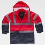Parka combinada acolchoada e impermeável em tecido Oxford com fitas refletoras. Parte superior de alta visibilidade. Gola tipo camiseiro e capuz interior ajustável com cordão. Fecho de correr de puxador duplo por aba com presilhas. Dois bolsos semi-embutidos laterais com lapela. Um bolso no peito de chapa no interior. Uma fita refletora nos ombros e duas no peito, nas costas e mangas. Punho com elástico no interior da manga.