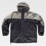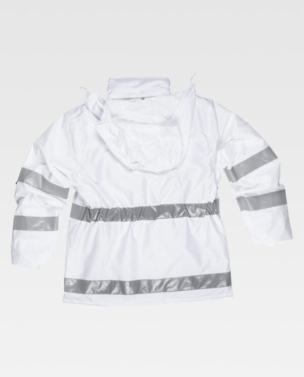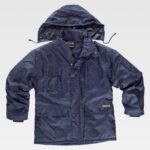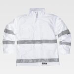 Parka acolchoada em tecido Oxford com fitas refletoras. Gola alta e capuz interior ajustável com cordão. Corpetes e fecho de correr oculto por aba com presilhas. Um bolso interior no peito com fecho de correr oculto e outro de fole com lapela de presilhas. Dois bolsos laterais de chapa com lapela de presilhas. Um bolso de chapa no peito com fecho de velcro no interior. Um bolso compartimentada na manga. Duas fitas refletoras no peito, nas costas e mangas. Punho elástico no interior da manga. Cintura elástica nas costas.