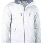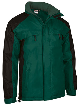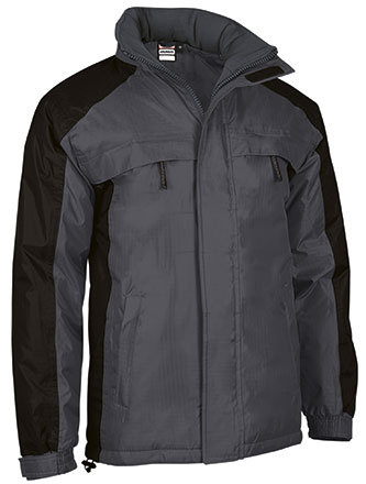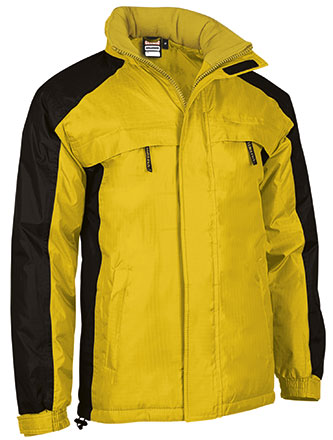 Parka impermeável com capuz dobrável e desenho bicolor. Confecionado com tecido impermeável Rip-Stop no exterior, forro interior liso, acolchoado interno e polar anti-pilling na gola melhor retenção térmica e conforto. Costuras termosseladas para evitar infiltrações de água e manter o corpo seco da chuva. Punhos ajustáveis com velcro e cintura reta com cordão elástico e stoppers para melhor ajuste e conforto. Dois bolsos inclinados na cintura, dois no peito e um bolso interior, todos com fecho de correr para ter tudo acessível. Acesso com fecho na parte interior das costas para facilitar a marcação: serigrafia, transfer, vinil, bordados, cosidos. Ideal como roupa de trabalho, têxteis publicitários e atividades ao ar livre.