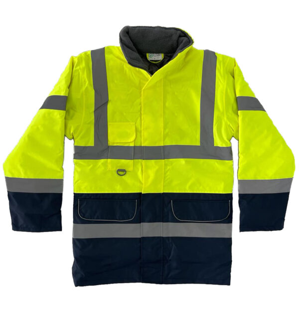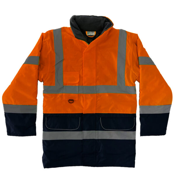 Gola polar e forro em tecido com alcolchoamento;Ajuste de fecho zipper e velcro na aba;3 bolsos exteriores + 1 bolso interior;Elástico na cintura e nas mangas;Capuz;Normas CE: EN ISO 20471:2013 e EN ISO 343:2003