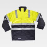 Parka ignífuga, antiestática com protecção para soldadura e arco eléctrico, de alta visibilidade. Gola alta e fecho de correr de metal e presilhas ocultas por aba. Dois bolsos no peito e dois bolsos laterais sobrepostos e com fecho de correr oculto. Uma fita refletora ignífuga nos ombros e dois no peito, nas costas e mangas. Punho elástico no interior da manga.