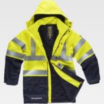 Parka ignífuga, impermeável, alta visibilidade, antiestática com protecção para soldadura, arco elétrico, químicos e frente ao frio. Gola alta e capuz interior. Fecho de correr metálico e molas ocultas por lapela. Dois bolsos laterais com lapelas de seguridade e fecho de mola oculta. Uma fita refletora termo-adesiva ignífuga nos ombros e duas fitas no peito, costas e mangas. Punho elástico no interior da manga.