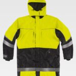 Parka ignífuga, impermeável, alta visibilidade, antiestática com protecção para soldadura, arco elétrico, químicos e frente ao frio. Gola alta e capuz interior. Fecho de correr metálico e molas ocultas por lapela. Dois bolsos laterais com lapelas de seguridade e fecho de mola oculta. Uma fita refletora termo-adesiva ignífuga nos ombros e duas fitas no peito, costas e mangas. Punho elástico no interior da manga.