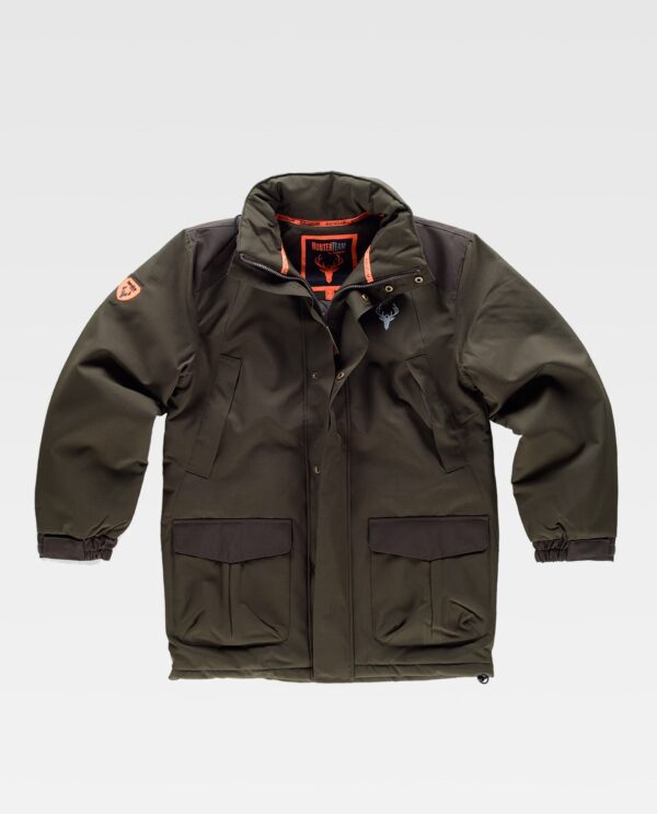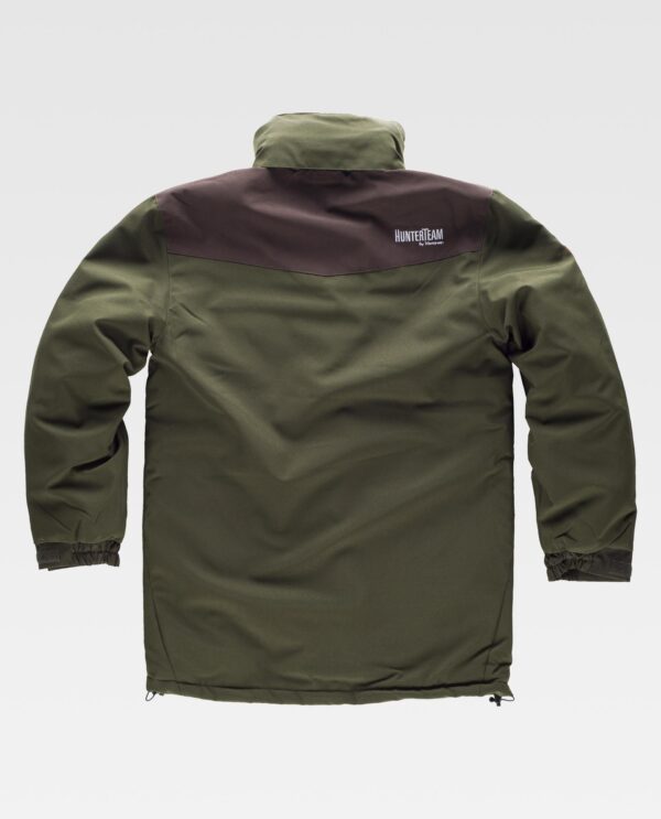 Parka impermeável acolchoada e combinada. Gola alta e capuz interior ajustável com cordão. Fecho de correr de náilon oculto por aba dupla e fecho de presilhas. Dois bolsos no peito sobrepostos com fecho de correr de náilon. Dois bolsos laterais com fole central e lapela de presilha oculta. Um bolso no peito de chapa com fecho de velcro no interior. Corpete nas costas e peças nos ombros combinados. Punho com elástico e ajuste de velcro. Cordão elástico com peça ajustável no baixo.