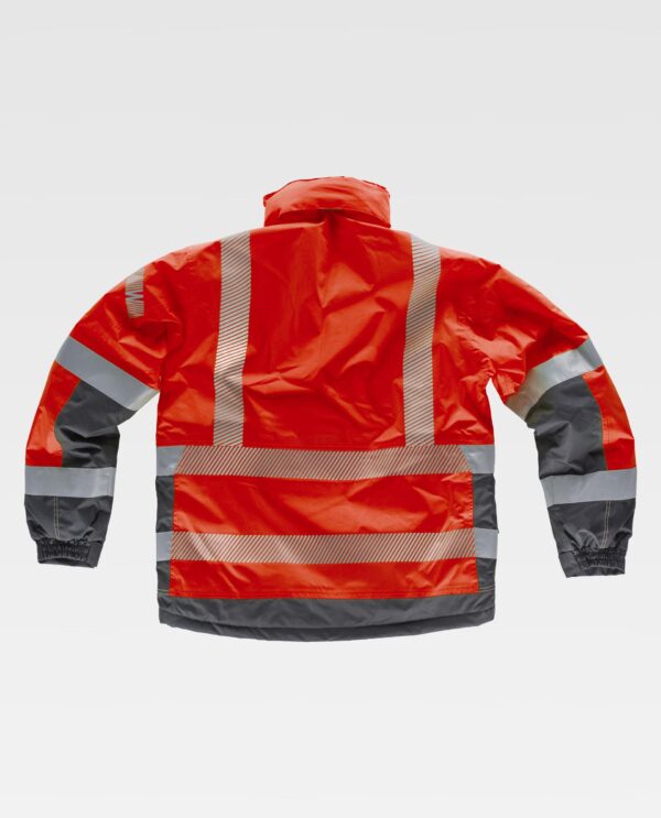 Parka acolchoada e impermeável em tecido Oxford, combinada e com fitas refletoras. Gola alta forrada com polar e capuz enrolável com cordão ajustável. Fecho de náilon oculto por aba postiça com velcro. Dois bolsos laterais inseridos com cremalheiras de náilon. Dois bolsos no peito inseridos com cremalheiras de náilon. Dois bolsos no interior com fecho de correr, um deles com saída para os auscultadores. Duas fitas refletoras segmentadas termo-adesivas nos ombros, peito e costas. Duas fitas cosidas nas mangas e nos laterais. Fita decorativa personalizada na manga. Punho ajustável com velcro e elástico. Cordão elástico com peça ajustável. Acesso interior para serigrafia. Tecido técnico com propriedades térmicas no interior das costas.