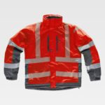 Parka acolchoada e impermeável em tecido Oxford com fitas refletoras. Gola alta forrada com polar e capuz enrolável com cordão ajustável. Fecho de náilon oculto por aba postiça com velcro. Dois bolsos laterais inseridos com cremalheiras de náilon. Dois bolsos no peito inseridos com cremalheiras de náilon. Dois bolsos no interior com fecho de correr, um deles com saída para os auscultadores. Duas fitas refletoras segmentadas termo-adesivas nos ombros, peito e costas. Duas fitas cosidas nas mangas e nos laterais. Fita decorativa personalizada na manga. Punho ajustável com velcro e elástico. Cordão elástico com peça ajustável. Acesso interior para serigrafia. Tecido técnico com propriedades térmicas no interior das costas.