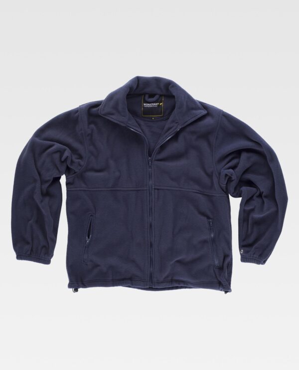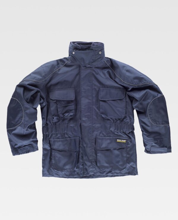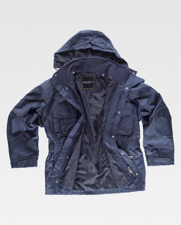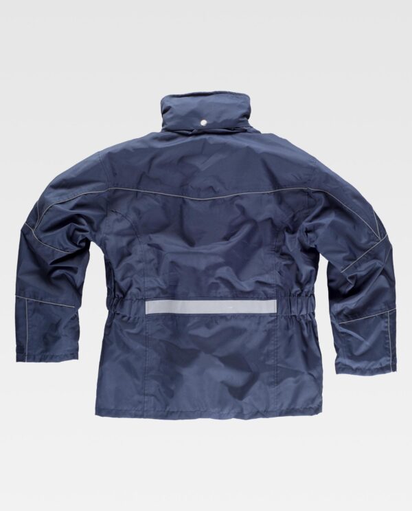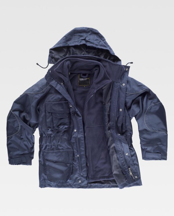 Parka com forro polar interior desmontável por meio de fechos de correr e presilhas. Exterior: Parka em tecido Oxford de gola alta revestida em polar com peça ajustável com presilha. Capuz interior ajustável com cordão. Fecho de correr de puxador duplo e presilhas ocultas por aba. Dois bolsos no peito e dois bolsos laterais com fole, um de eles duplo, todos com lapela de velcro. Bolsos auxiliares sobrepostos. Dois bolsos no peito de chapa com fecho de velcro e bolso auxiliar no interior. Corpete nas costas e acabado com debrum refletor que segue na manga. Punho ajustável com velcro. Elástico nos laterais da cintura e uma fita refletora nas costas. Interior: Casaco polar de gola alta e fecho de correr. Dois bolsos laterais com fecho de correr. Punho com elástico. Cordão elástico com peça ajustável no baixo.