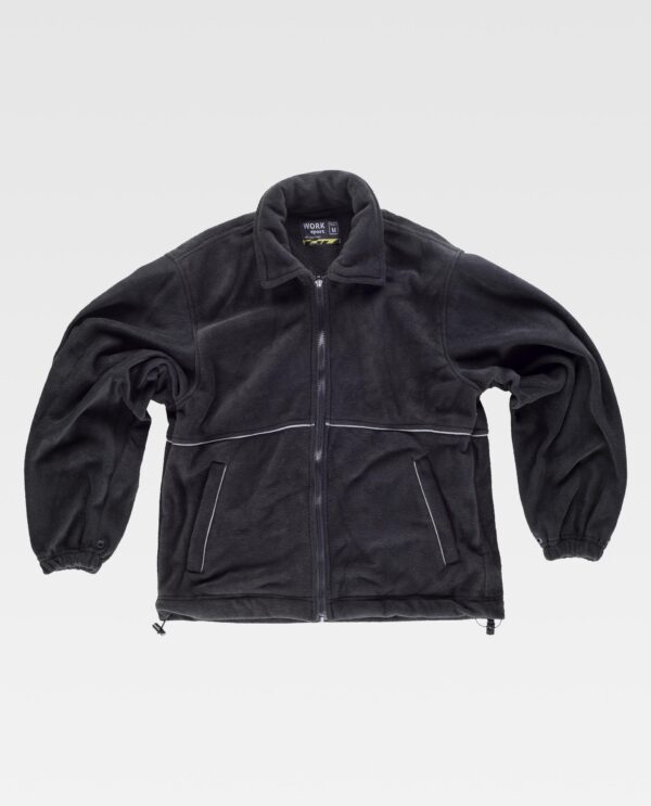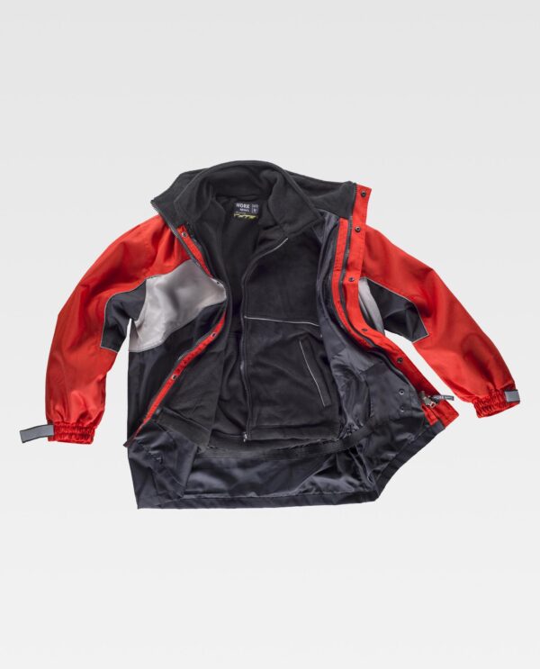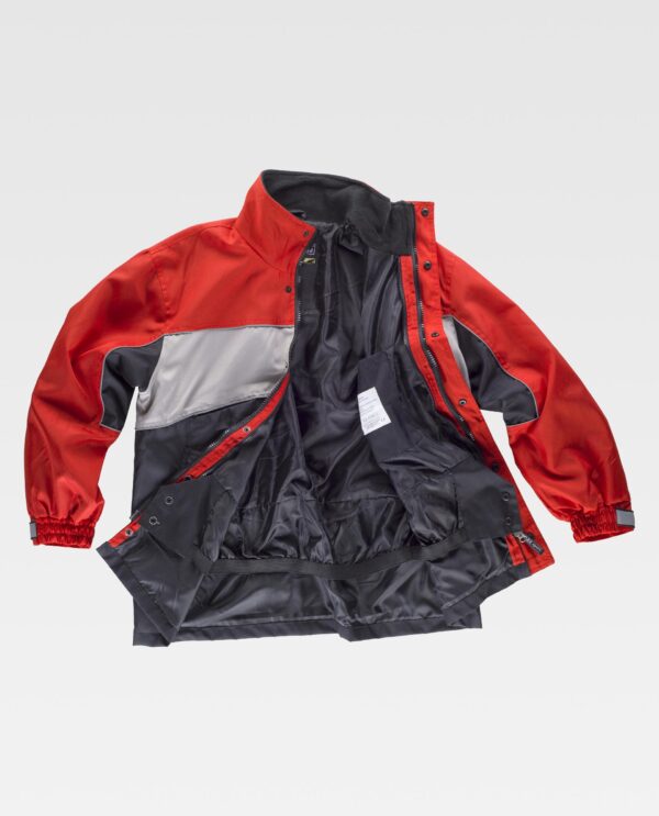 Parka com forro polar interior desmontável por meio de fechos de correr e presilhas. Exterior: Parka combinada tricolor de gola alta revestida com polar. Fecho de correr de puxador duplo oculto por aba com presilhas. Dois bolsos no peito interiores com fecho de correr. Dois bolsos laterais com fecho de correr e aba de presilha. Um bolso no pecho de chapa com fecho de velcro no interior. Punho com elástico e regulação de velcro. Forro ajustável no interior da cintura com fecho de presilhas. Debruns refletores. Interior: Casaco polar de gola alta e fecho de correr. Dois bolsos laterais com fecho de correr. Punho com elástico. Cordão elástico com peça ajustável no baixo. Debruns reflores.