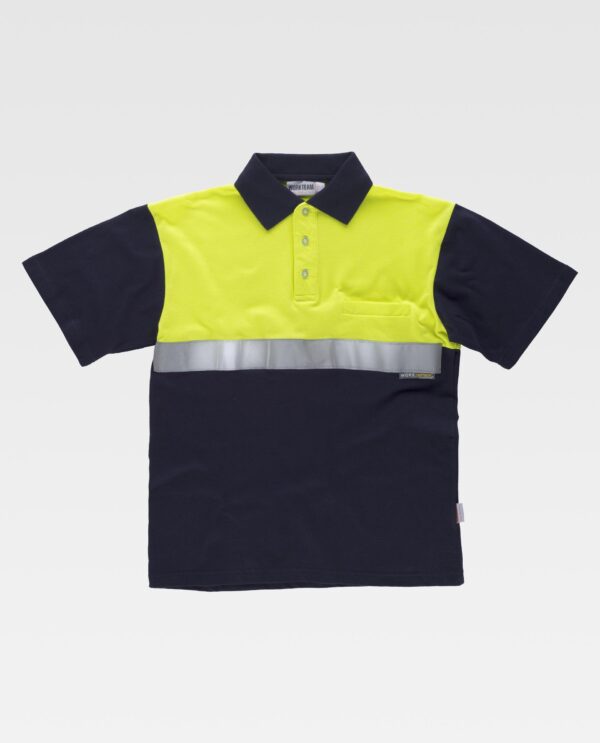Pólo combinado de manga curta em pique de algodão com fita refletora. Parte superior flúor. Gola clássica com carcela de três botões e abrange nas costuras interiores. Um bolso semi-embutido no peito. Refletor no peito e nas costas. Tecido fresco e poroso que permite uma ventilação adequada. Gola em ponto de canelado. Aberturas laterais.