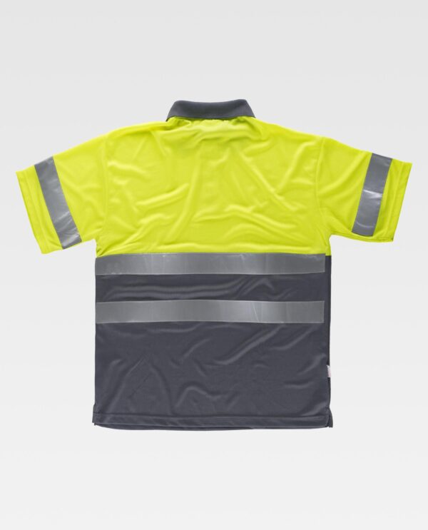 Pólo combinado de manga curta em poliéster bird’s eye com fitas refletoras. Parte superior de alta visibilidade. Gola clássica com carcela de três botões e abrange nas costuras interiores. Aberturas laterais. Uma fita refletoras nas mangas e duas no peito e nas costas. Tecido fresco e ligeiro de alta permeabilidade do ar. Transpirável, de fácil secagem e resistente a encolher. Gola em ponto de canelado.