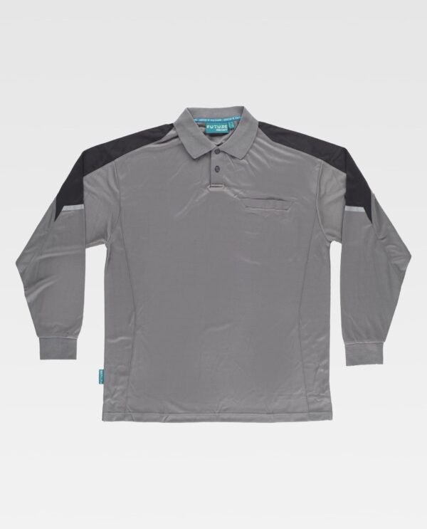 Pólo combinado de manga comprida em micropique com detalhes refletores. Gola clássica com lapela de dois botoes. Um bolso no peito e punho elástico. Gola em ponto de canalé.
