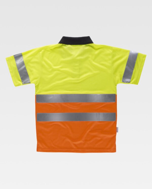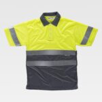 Pólo combinado de manga curta em poliéster bird’s eye com fitas refletoras. Gola clássica com carcela de três botões e abrange nas costuras interiores. Uma fita refletora nas mangas e duas no peito e nas costas. Tecido fresco e ligeiro de alta permeabilidade do ar. Transpirável, de fácil secagem e resistente a encolher. Gola em ponto de canelado. Aberturas laterais.