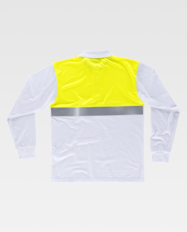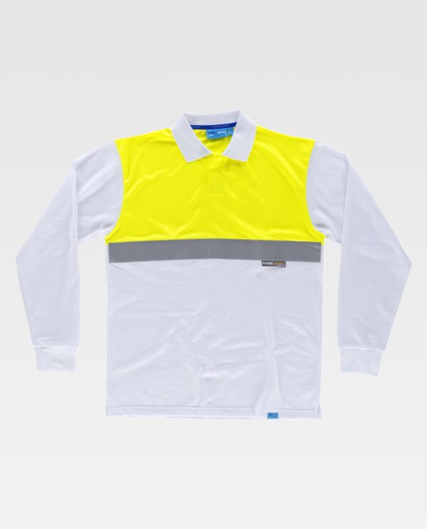 Pólo combinado de manga comprida com fita refletora em tecido piqué de algodão com tratamento antibacteriano. Parte superior de alta visibilidade. Gola clássica sem botoes. Uma fita refletora no peito e costas. Tecido técnico transpirável com tratamento com iões de prata para inibir o crecimento das bacterias e assim evitar a absorção da humidade e o mau cheiro. Gola a ponto de canelado. Aberturas laterais.