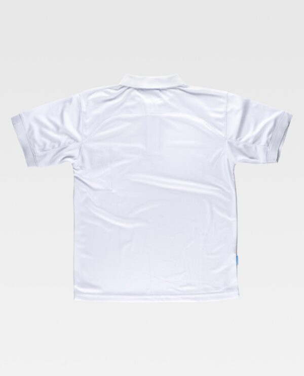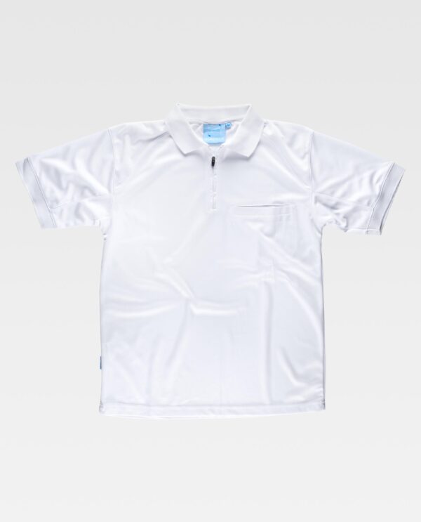 Pólo workdry de manga curta em micro pique. Gola clássica com fecho de fecho de correr de náilon. Abrange as costuras no interior da gola. Um bolso semi-embutido no peito. Corte decorativo nos ombros e mangas. Corpete nas costas e costuras reforçadas. Transpirável, resistente e de secagem rápido. Gola e acabado da manga em ponto canalé.