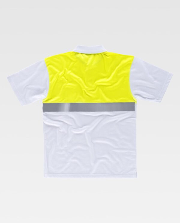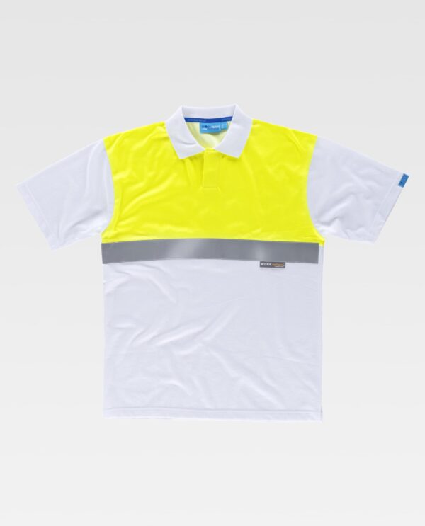 Pólo combinado de manga curta com fita refletora em tecido piqué de algodão com tratamento antibacteriano. Parte superior de alta visibilidade. Gola clássica sem botões. Uma fita refletora no peito e costas. Tecido técnico transpirável com tratamento com iões de prata para inibir o crecimento das bacterias e assim evitar a absorção da humidade e o mau cheiro. Gola a ponto de canelado. Aberturas laterais.