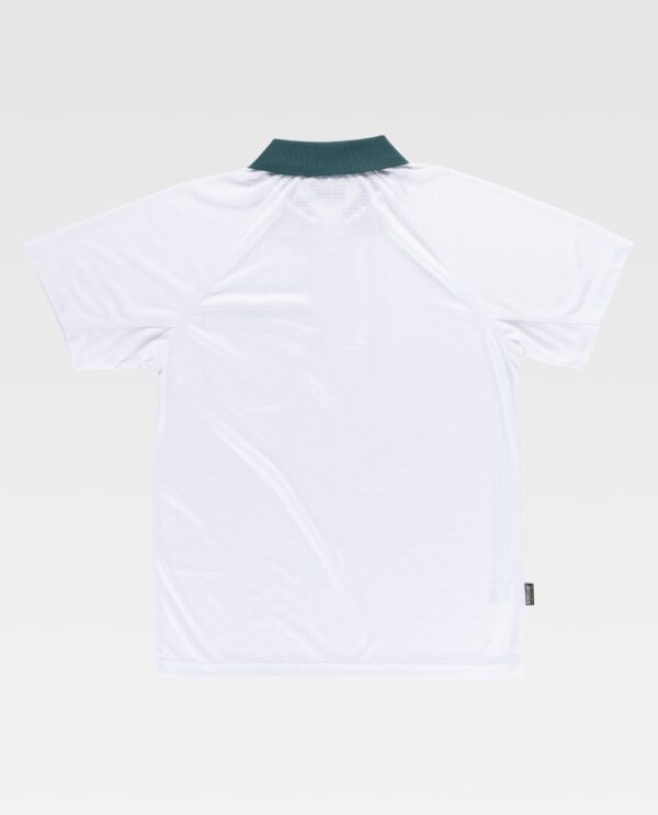 Pólo combinado de manga curta em tecido técnico. Gola clássica com carcela de três presilhas. Abrange nas costuras no interior da gola, costuras reforçadas e manga raglã. Um bolso semi-embutido no peito. Detalhe do bolso, gola e peça da gola em contraste. Desportiva, ligeira e de secagem rápida. Gola em ponto de canelado.