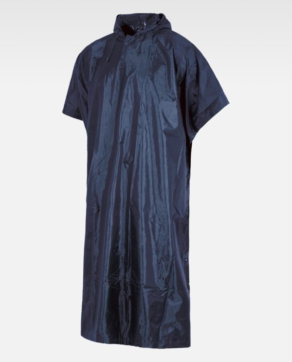 Poncho impermeável de corpo inteiro. Capuz ajustável com cordão. Gola com carcela de duas presilhas. Aberturas laterais com fecho de presilhas.