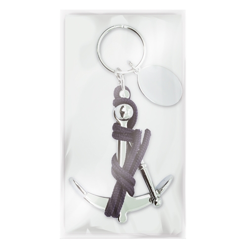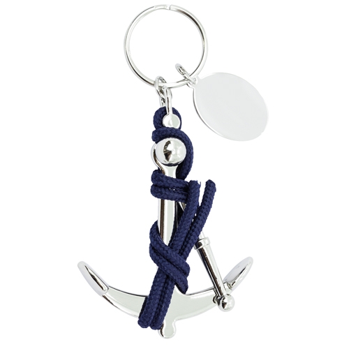 Porta-chaves com âncora de marinheiro ligada por uma corda azul. Inclui uma placa para marcação a laser.Cada peça em bolsa individual com fecho automático (é fornecida aberta, para facilitar a sua manipulação).