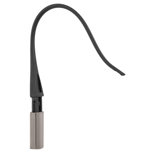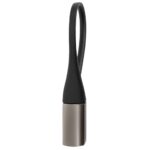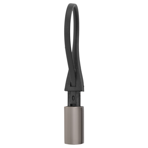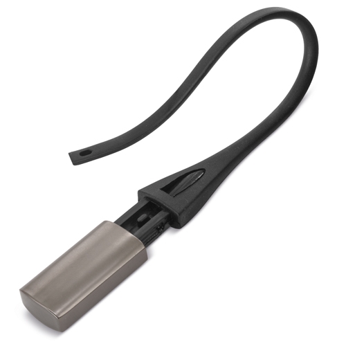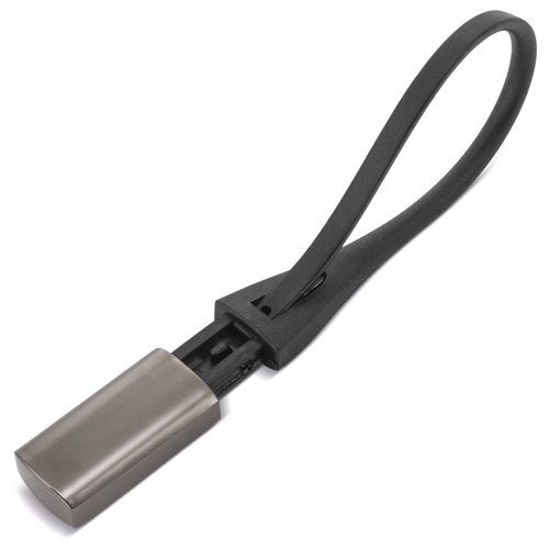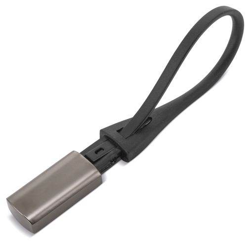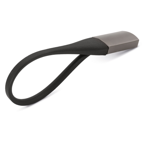 Porta-chaves com corpo metálico, combinado com uma resistente fita de silicone preta em forma de laço.